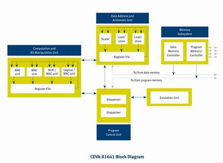 CEVA-X1641是CEVA-XDSP系列中的一款四MAC單元產品,由4個16位數(shù)據(jù)寬度的MAC單元組成。在65nm的最差條件下,CEVA-X1641也能夠在700MHz以上的高頻下運行。