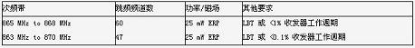 如表三所示,為使用FHSS時,歐洲的擴展頻帶上(低于870MHz)所需要的頻道數量、有效發射功率(ERP)、及工作週期。當符合"說前先聽(listen-before-talk,LBT)"或是工作週期有效率限制值時,便可有高達7MHz的頻寬可供使用,以往則只有2MHz的范圍。