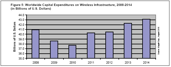 預計2011年全球無線基礎設施上面的資本支出預計達到403億美元,逆轉2009年開始的下滑態勢,今年將繼續增長。2009年支出下降5.7%,2010年將下降2.3%至378億美元。