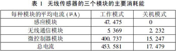 無線傳感器的三個主要消耗電能的模塊是:感應模塊、無線通信模塊和微控制器模塊,如表1所示。這三個模塊主要有兩個操作模式:關機模式和工作模式。在這兩種模式下分析了每種模塊的功耗,以及總的消耗量。