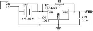 無線傳感器通常的工作電壓范圍為3.0V~3.6V。此次電源設計加入了TLFA274穩壓器(如圖2所示),可轉換3V~40V的電壓,比如通常使用的小型電池或者是汽車電池,給使用者帶來了很大的方便。
