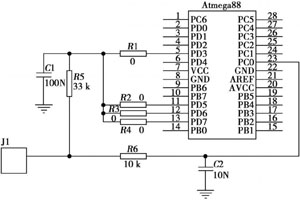 對微控制器芯片選擇Atmel ATmega88,因為它具有低功耗,還有待機模式和主動模式的快速轉換功能,所以無線傳感器能夠在非常短的時間完成數據的測量和傳輸;它有一個內置的掉電檢測電路,可用來提醒用戶傳感器網絡電池是否需要更換;它還有一個內置的A/D轉換器,可以將傳感器的模擬信號轉換成具有10位數字值的數字信號(零代表0V,210-1代表電源電壓和最大可能電壓)。