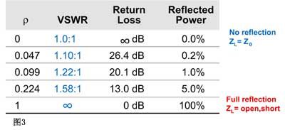如果某個(gè)信號(hào)波從一種特征阻抗傳輸?shù)搅硪环N不同的特征阻抗,那么就會(huì)引起信號(hào)反射和反向傳輸。如果阻抗相同,就不會(huì)發(fā)生反射。當(dāng)由于阻抗不連續(xù)而發(fā)生信號(hào)發(fā)射時(shí),就會(huì)在傳輸線的兩個(gè)方向上出現(xiàn)信號(hào)波的傳輸。在這兩個(gè)波相位相同的點(diǎn)上,將出現(xiàn)最大的電壓幅值Vmax;在它們相位相差180度的點(diǎn)上,將出現(xiàn) Vmin。Vmax和Vmin的比值稱為電壓駐波比,即VSWR。VSWR是衡量某個(gè)連接器或某條線纜的阻抗是否接近50歐姆的一個(gè)指標(biāo)。圖3給出了理想情況下全匹配(沒有反射)、理想開路(100%反射),以及極端情況下這三個(gè)值之間的關(guān)系。