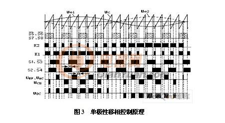 實現單極性移相控制的方案為:1、將輸出電壓反饋信號uof與正弦基準電壓uref比較放大后得到電壓誤差放大信號ue1,ue1與載波uc比較后得到信號k1,k1下降沿二分頻、反相互補后分別得到功率開關S1、S3的驅動信號;2、將ue1反極性信號ue2與載波uc比較后得到信號k2,k2下降沿二分頻、反相互補后分別得到功率開關S2、S4的驅動信號;3、將載波uc下降沿二分頻、反相互補后分別得到功率開關S5(S6)、S7(S8)的驅動信號。