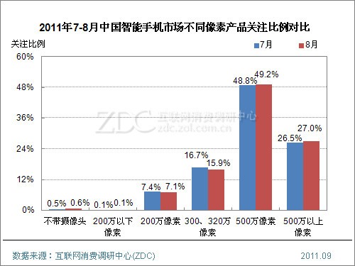 (圖)2011年7-8月中國智能手機市場不同像素產品關注比例對比
