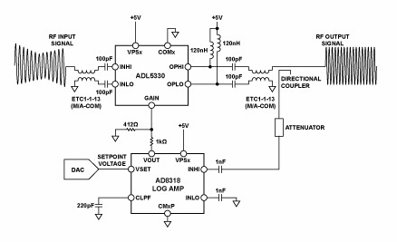 圖1:ADL5330與AD8318配合在自動增益控制環路中工作