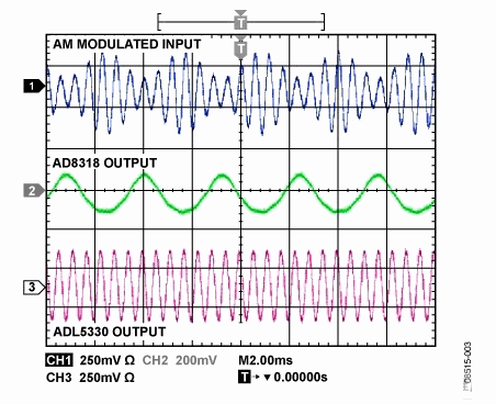 為使AGC環路保持均衡,AD8318必須跟蹤ADL5330輸出信號的包絡,并向ADL5330的增益控制輸入提供必要的電平。圖3所示為圖1中 AGC環路的示波器屏幕截圖。將采用50% AM調制的100 MHz正弦波施加于ADL5330。ADL5330的輸出信號為恒定的包絡正弦波,其振幅與AD8318的設定點電壓1.5 V相對應。圖中還顯示了AD8318對不斷變化的輸入包絡的增益控制響應。