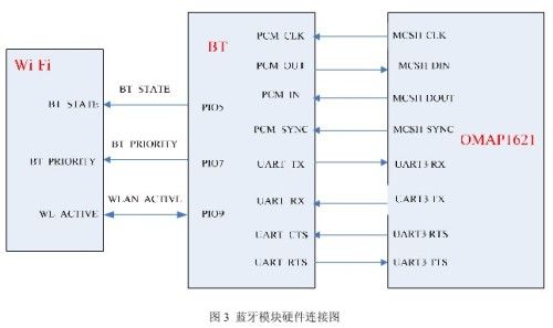 AFH技術(shù)在上面已經(jīng)介紹過了,單獨使用AFH技術(shù)使用藍牙耳機的通話效果不是很好,為了解決這種問題,在使用AFH技術(shù)的基礎(chǔ)上又使用了三線共存(時分復(fù)用)技術(shù)。三線共存,顧名思義,就是使用三根線連接Wi-Fi和藍牙,下面結(jié)合圖3中Wi-Fi和藍牙所示的三線連接圖來描述一下三線共存的機制,其中主處理器使用的是TI公司的OMAP1621芯片。