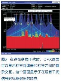 在進行頻率規劃,把每個閱讀器限定在某條通道(或多條通道)時,可以使用DPX保證調制邊帶的電平不會在并放閱讀器使用的通道中產生干擾。注意圖6中心的閱讀器和標簽信號擁有寬頻譜展寬,駐留時間要長于其它通道。較亮的信號邊緣表明信號密度較高,因此駐留時間較長。這可能會導致鄰道讀取失敗,應采取措施,保證閱讀器中的濾波功能足以抗擊這種干擾。