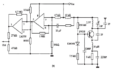 該部分電路主要由315MHz無線數據發射模塊和編碼集成PT2262組成。該無線發射模塊原理圖如圖1中(b)所示,它具有較寬的工作電壓范圍3-12V,當電壓變化時發射頻率基本不變,和發射模塊配套的接收模塊無需任何調整就能穩定地接收。當發射電壓為3V時,空曠地傳輸距離約20-50m,發射功率較小;當電壓5V時約100-200m)當電壓9V時約300-500m;當發射電壓為12V時,為最佳工作電壓,具有較好的發射效果,發射電流約60毫安,空曠地傳輸距離700-800m,發射功率約500mW.當電壓大于12V時功耗增大,有效發射功率不再明顯提高。發射模塊采用ASK方式調制,以降低功耗。當數據信號停止時發射電流降為零,數據信號與DF發射模塊輸入端可以用電阻或者直接連接而不能用電容耦合,否則DF發射模塊將不能正常工作。數據電平應接近DF數據模塊的實際工作電壓,以獲得較高的調制效果。