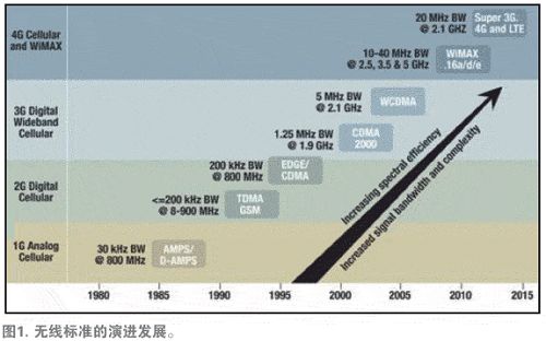 為了解決這一問題,無線提供商轉而采用了可提高頻譜效率的無線標準。這類似于將多輛駛往同一目的地的轎車碼放在一輛卡車上,并將卡車沿著高速公路開往目的地。這種方法使相同的高速公路上可以實現更多的數據傳輸流量,而不會導致流量降低。為了提高頻譜效率,我們可部署或定義所有的無線標準,其中包括CDMA2000、W-CDMA、TD-SCDMA、MC-GSM、WiMAX以及LTE等。圖1顯示了近年來用于提高頻譜效率所部署或定義的無線標準。