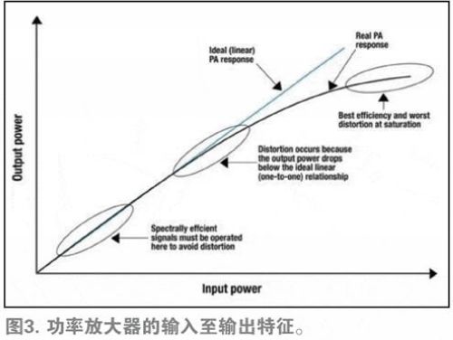 從圖3可以了解PA的工作原理。如藍線所示,理想的PA具有線性或一對一響應。比如,如果提高10%的輸入功率,那么輸出功率也將相應提高10%。而現實世界中PA的性能如黑色曲線所示,PA性能在輸出功率處于極低水平的情況下與理想的PA一致,而在較高的輸出功率水平下則會下降至理想PA之下。例如,如果將現實世界中PA的輸入功率提高10%,其輸出功率僅會提高9%。因此,即使在輸入功率不斷提高的情況下,PA的輸出功率也將停止上升。