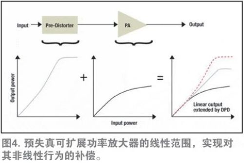 自適應DPD可以擴展寬頻帶射頻(RF)PA的直線性能(straight-line performance),而且遠遠超過正常擴展范圍。如前所述,當輸出功率增加時,輸出功率與理想線性性能曲線發生偏離。這正是PA放大輸出信號出現失真的地方,從而導致信號質量下降及干擾。DPD可將PA失真輸出信號與非失真輸入信號進行比較。然后,將輸出信號中一個與失真正好對立的信號添加至輸入,從而有效消除失真。由于DPD可擴展PA的線性范圍,因此將其稱為線性化技術(如圖4)。
