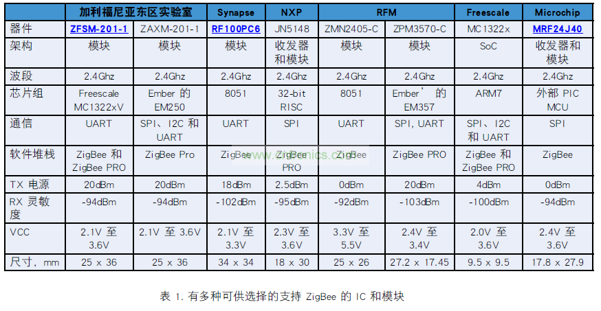 IC 和模塊中都提供有 ZigBee 解決方案(見表1)。 商業使用本規范不收取費用 - 制造商必須屬于 ZigBee 聯盟,最終產品必須