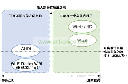 Wi-Fi Display、WiDi和WHDI因電波比較容易迂回,適用于在不同房間的連接,采用60GHz頻帶毫米波的WirelessHD和WiGig雖然可以確保傳輸速度,但如果有障礙物的話,電波難以到達,因此主要在一個房間內使用。
