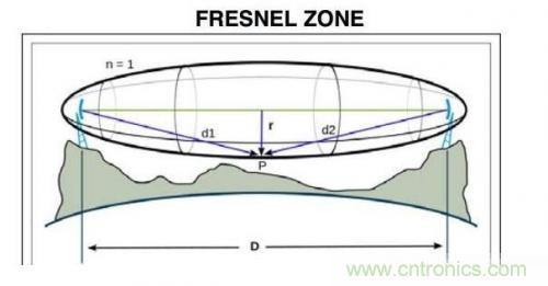 菲涅爾區(qū)是指無(wú)線電波離開(kāi)天線后在可視距離周圍傳播的區(qū)域,如圖2所示。擁有視距對(duì)于保持強(qiáng)度有利,對(duì)于2.4GHz無(wú)線系統(tǒng)更是如此,原因在 于2.4GHz波易被水吸收。根據(jù)經(jīng)驗(yàn),必須有60%的菲涅爾區(qū)不存在障礙物。通常,20%的菲涅爾區(qū)被阻擋時(shí)幾乎不會(huì)引起鏈路信號(hào)損耗,而這一比例超過(guò) 40%時(shí)信號(hào)損耗將非常明顯。