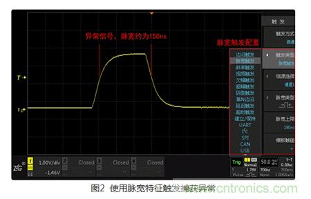 通過Step1,可以大概了解到異常信號的特性,將其特有的條件視為觸發(fā)條件,利用觸發(fā)可快速的捕獲異常信號。ZDS2000系列示波器免費標配了多種“觸發(fā)類型”,其中包括11種基礎觸發(fā),21種協(xié)議觸發(fā)。另外,用戶還可根據波形的形狀特性,使用“模板觸發(fā)”,讓觸發(fā)更加隨心所欲。