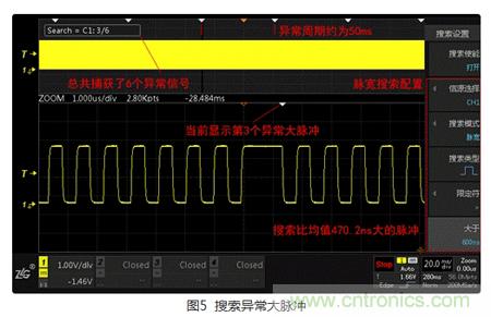 在調試異常信號時,我們通常需要明確,異常出現的頻率是多少,是不是周期性出現的呢?為了弄清楚這些問題,一般需要長時間記錄波形,然后基于這樣一個龐大的數據庫去定位和分析異常。ZDS2000系列示波器標配的“搜索功能”,可以在海量的數據中快速定位出感興趣的信號,并自動做出標記,用戶通過觀察標記可快速了解異常的位置、頻率、周期等特性。