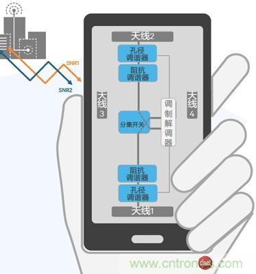 值得一提的是,高通的整合解決方案還支持載波聚合的TruSignal自適應天線調諧技術。TruSignal可被看作是三項技術的總稱:第一是主分集天線切換,它是用來解決手機“死亡之握”的問題——手機的主天線一般是在手機的下方,當人們用手握住它的時候,信號會掉得非常快,當下方主天線被握死時,它可以將天線切換到上面的分集天線去;第二是天線調諧——天線調諧技術又包含兩類,一類叫孔徑調諧,一類叫阻抗調諧,通過調諧天線的匹配,可以解決天線和PA之間的適配問題;第三是高階分集接收——通過增加分集來提升接收性能,以及接收的下行速率。