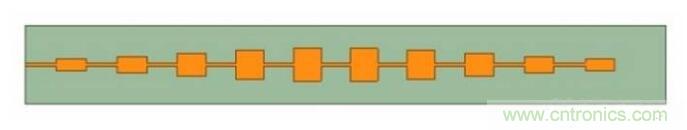 在串饋微帶貼片陣列中,每個貼片天線的寬度正比于貼片天線等效導納,而等效導納又正比于該貼片的激勵功率;因此通過并調節線陣中每個貼片的寬度,可以改變該天線的激勵功率,從而實現線陣激勵的錐削分布,滿足防撞雷達天線在俯仰面對于低副瓣的要求。