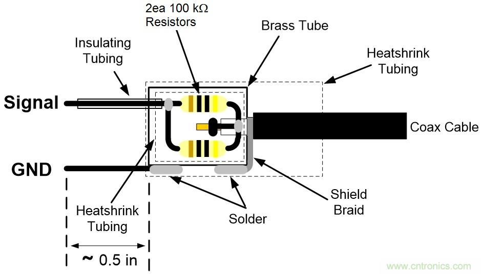 圖1:1000:1、 50Ω電壓探頭使用兩個100kΩ電阻并聯(lián),比使用單個50kΩ電阻的功率耗散能力增加了一倍。
