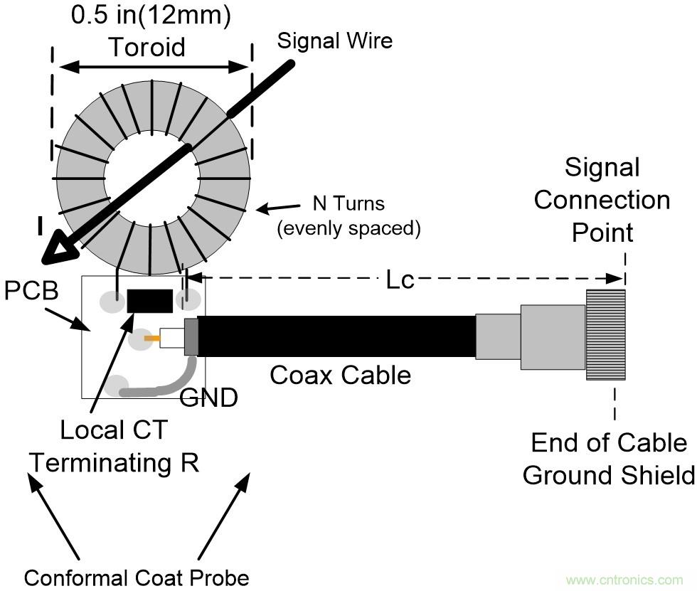 圖2所示的電流探頭使用SMD電阻,這就是為什么需要一個小PCB來安裝它并固定到同軸電纜的末端。務(wù)必保形涂覆整個電流互感器組件;繞組非常脆弱,同軸電纜會給電流探頭帶來很大的機械應(yīng)力。