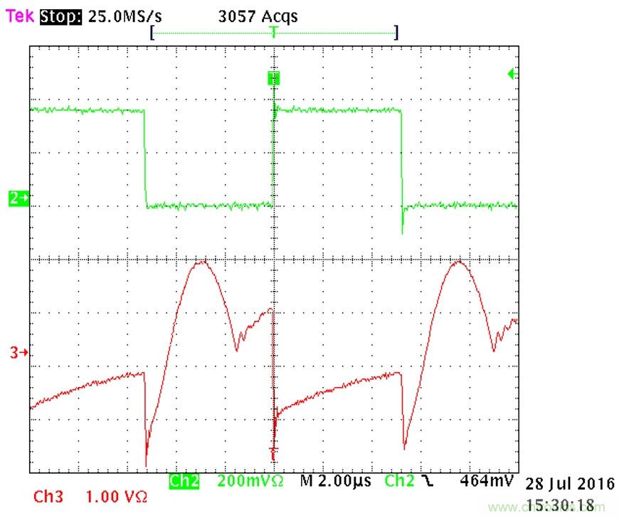 圖5:電流探頭會因為時間常數(shù)使輸入信號失真。上部(綠色)跡線為干凈的VDS,下部(紅色)跡線為失真的ID。
