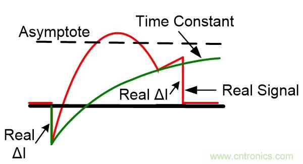 圖6顯示了如果在目標電路同一位置的電流檢測電阻上查看,實際信號是如何按預(yù)期出現(xiàn)的。盡管內(nèi)心里想以任何精度從顯示信號中減去時間常數(shù),但這在數(shù)學(xué)上不切實際。因此,關(guān)于顯示可信度的陳述與電流轉(zhuǎn)換相去甚遠。當(dāng)然,也可以花大價錢買一個磁性“DC”電流探頭幫你做上述數(shù)學(xué)計算,但是帶寬太低。