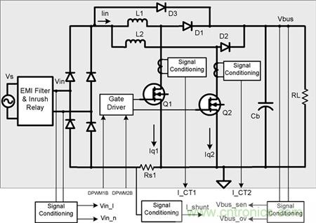 您可以看到固件外部仍有可使用示波器進行監控的模擬信號。另外,您是否注意到方框底部輸出的信號?這些信號將進入 UCD3138 數字控制器并由固件處理,請看下圖。