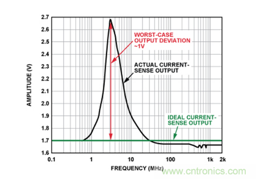 圖2所示為輸入在較寬頻率范圍內(nèi)變化時(shí)電流傳感器的直流輸出與其理想值的偏差情況。從圖中可以看出,在1 MHz至20 MHz的頻率范圍內(nèi),偏差最為顯著(>0.1 V),且3 MHz時(shí)直流誤差達(dá)到最大值(1 V),這在放大器0 V至5 V的輸出電壓范圍中占據(jù)很大比例。