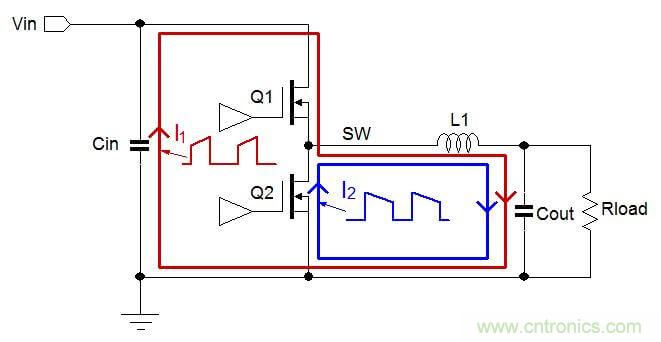 當上橋MOSFET Q1導通的時候,電流從電源流出,經Q1和L1后進入輸出電容和負載,再經地線回流至電源輸入端。在此過程中,電流中的交變成分會流過輸入電容和輸出電容。這里所說的電流路徑如圖2中的紅線所示,它被標注為I1。