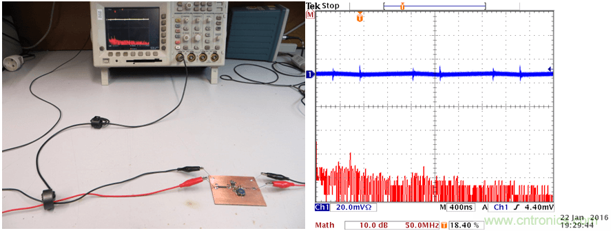 采用了上述的方案以后,單面板上的開關切換波形上的過沖已經完全消失,經環形天線檢測到的輻射噪聲也很低,它在經過FFT運算后得到的波形幾乎都在本底噪聲水平上。