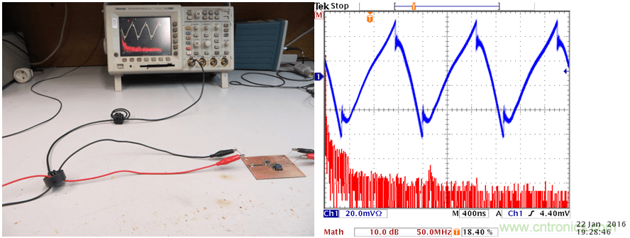自制的EMI電流測試工具(見第8章)可被安置在電源輸入線和輸出線上。在本文中,我們是用示波器來觀看測量到的高頻電流信號,它能顯示出轉換器開關切換期間的高頻小信號。對于這種重復出現的開關切換信號而言,使用示波器的FFT功能進行計算并看到測量電流中的各種頻率成分是可能的。這種方法雖然不如頻譜分析儀那么精確,但仍然不失為一種非常實用的工具,可在簡單電路的分析中提供判斷依據。