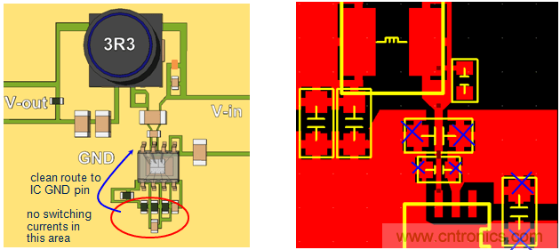 在上面的例子中,通到地線層的附加導通孔對縮減CIN回路的長度沒有幫助。但在另一個例子中,由于頂層的路徑很長,通過導通孔來縮小回路面積就十分有效。