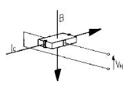 在這兩個(gè)邊緣之間產(chǎn)生的霍爾電壓VH與控制電流IC和磁通量B直接成正比(圖1)。霍爾發(fā)生器由一片薄傳導(dǎo)材料制成,如鎵砷化物(GaAs),這種材料在使用期間能夠?qū)崿F(xiàn)可靠穩(wěn)定的性能。在5 mA的控制電流下,獲得的霍爾電壓約為1.25 mV/mT。