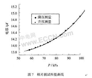 在室溫19.34℃的條件下,對壓力傳感器進行測量。測量設備為Druck的DPI610IS,測量電路采用了AD公司的AD7745電容測量芯片,精度能達到4 fF。測量曲線如圖7所示,測試精度為8.1‰。由于硅薄膜較厚,測量范圍內的線性部分不多,此外電容電極的面積利用率不高使得電容的變化量也小,這些都是造成性能不高的主要原因,但由圖可以看出測量曲線存在很好的一致性和重復性。