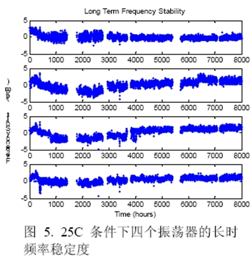 圖6顯示了在進(jìn)行溫度循環(huán)試驗時兩個振蕩器的頻率穩(wěn)定度。數(shù)據(jù)在-50℃到+80℃正溫度循環(huán)和負(fù)溫度循環(huán)中的30℃情況下獲得,數(shù)據(jù)采集自600個溫度循環(huán),以3ppm為規(guī)范容許范圍則沒有頻率漂移。