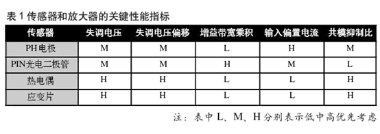 選擇放大器與傳感器正確接口時,設計人員必須使放大器與傳感器特性匹配。可靠的放大器特性對于傳感器——放大器組合的工作是關鍵性的。傳感器和放大器的關鍵性能指標見表1。例如,PH電極是一個高阻抗傳感器,所以,放大器的輸入偏置電流是優先考慮的(表中的H)。PH傳感器所提供的信號不允許產生任何相當大的電流,所以,放大器必須是在工作時不需要高輸入偏置電流的型號。具有低輸入偏置電流的高阻抗MOS輸入放大器是符合這種要求的最好選擇。另外,對于應用增益帶寬乘積(GBP)是低優先考慮(表1中L),這是因為傳感器工作在低頻,而放大器的頻率響應不應該妨礙傳感器信號波形的真正再生。