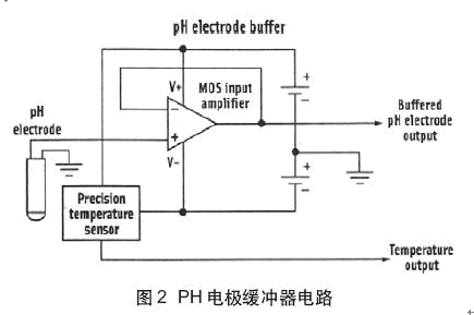 高阻抗PH傳感器可與具有低功率電路(僅需要2個1.5V電池供電)的放大器配對(圖2)。放大器MOS輸入晶體管為傳感器提供高阻抗,傳感器輸出阻抗為1MW或更大。此放大器的輸入偏置電流小于1pA,所以,放大器工作消耗非常小的電流。放大器的失調電壓小于1mV。放大器提供軌到軌工作并具有高驅動能力,能在長線上發送信號(放大器遠離ADC的情況)。在電路中增加了一個精密溫度傳感器,可以測量PH傳感器的溫度。這使得具有精確的PH溫度補償值。
