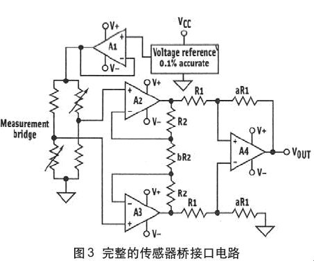測量應變片傳感器通常要通過橋網絡,應變片構成橋的兩個(或4個)臂。應變片是低源阻抗器件,其輸出信號范圍是小的(幾百微伏~幾毫伏)。圖3所示的電路能為精確測量傳感器信號提供測量橋穩定激勵電壓和高共模電壓抑制(CMR),消除了任何共模電壓。用高精度和非常低漂移(隨溫度)的精密電壓基準驅動放大器A1。這可為橋提供非常精確、穩定的激勵源。因為共模電壓大約為激勵電壓的一半,所以被測信號僅僅是橋臂之間小的差分電壓。放大器A2、A3、A4必須提供高共模抑制比(CMRR),所以僅測量差分電壓。這些放大器也必須具有低值輸入失調電壓(VOS)漂移(也稱之為失調電壓溫度系數TCVOS)和輸入偏置電流,以使得從傳感器能精確地讀數。放大器A1~A4連接成儀表放大器以達到上述目標。這種配置的電壓增益(AV)為:AV=(1+2R2/bR2)(aR1/R1),其中a和b是確定總增益的比值。