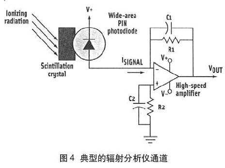 輻射譜測量來自輻射源的發射能量的分布,輻射源可以是粒子,X射線或γ射線。輻射照到閃光晶體上并發射強度正比于能量的短脈沖。然后由PIN光電二極管把光轉換為電流。放大器(見圖4)用做首置放大器和PIN光電二極管輸出的電流/電壓轉換器。此電路為用于基本輻射譜的單通道分析儀。信號的脈沖幅度包含重要信息,所以低輸入失調電壓和低失調電壓漂移是重要的。寬帶寬為處理脈沖(可窄到幾納秒)提供快速響應。首置放大器輸出(VOUT)到脈沖幅度分析儀(如快速ADC)來測量和儲存每個峰值發生的數。分布是單個源的光譜。反饋電阻R1值取決于來自PIN光電二極管的最大電流和到ADC的最大輸出電壓。因此,R1=(Max VOUT)/(Max ISIGNAL)。電容C1用于PIN光電二極管寄生電容的補償。R2和C2相當于R1和C1用于補償放大器非倒相輸入的輸入偏置電流。