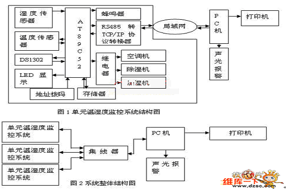 由AT89C52外加時鐘模塊、測溫度模塊、測濕度模塊、LED顯示模塊、外部存儲模塊、地址模塊、空調機、加濕機、除濕機驅動模塊等組成一個具體的溫濕度監控儀。