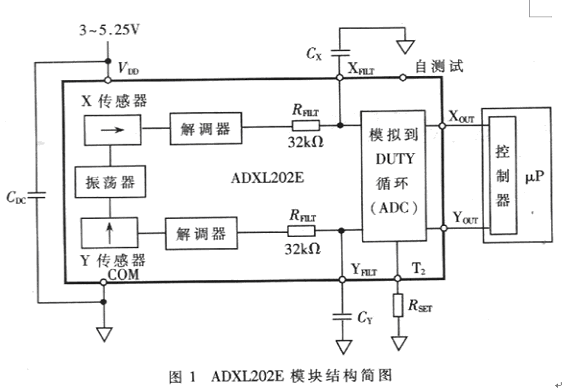ADXL202的模塊結構如圖l所示,它是在單一芯片上集成兩個相互獨立、測量方向相互垂直的敏感元的測量模塊,是由多晶硅微加工表面工藝制成的電容式加速度傳感器;由硅片表面的彈性結構支撐起的質量塊下面貼附電容的一個極板,電容的另一極扳固定。當加速度引起質量塊的相對位置變化時,電容值也發生變化;兩個敏感元的信號處理電路將各自的電容變化轉換成幅值與加速度成正比的方波信號,經工作周期調制(DCM)后,就能將模擬信號轉換為數字信號,通過引腳XOUTYOUT進行輸出。另外,ADXL202還可以通過XFILT、YFILT引腳輸出模擬信號。
