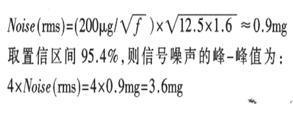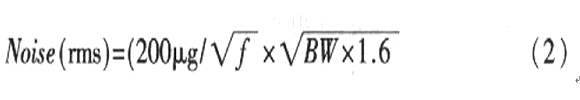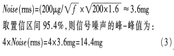 傾斜角度測量值通過XOUT、YOUT端口輸出的數字信號得到。由于經XFILT、YFILT端口的電容低通濾波,信號帶寬為200Hz.則根據ADXl202的噪聲計算公式為: