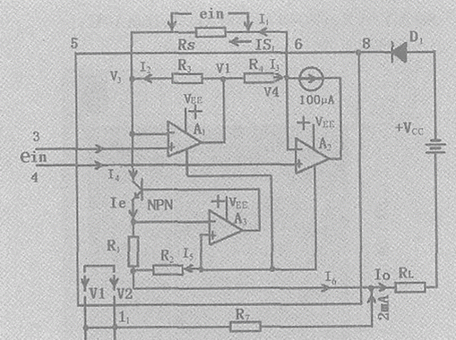 Rs為增益調(diào)節(jié)電阻,調(diào)節(jié)Rs可使輸入電壓ein在從最小值變到最大值時(shí)使輸出電流Io從4mA變到20mA。即△I=16mA的輸出電流。需要注意的是:為使Io不超過20mA,當(dāng)Rs=∞時(shí),ein不應(yīng)超過1V,而當(dāng)Rs減小時(shí),ein也應(yīng)相應(yīng)減小。