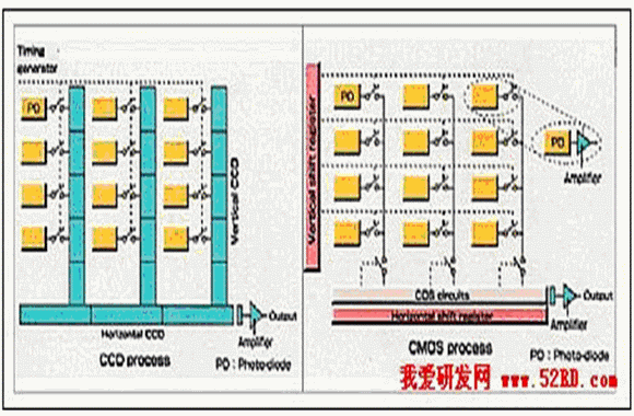 - 通過(guò)圖片形象比較CCD和CMOS在構(gòu)造和性能的不同