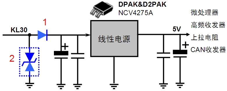 NCV4275A是一款帶復(fù)位和延遲功能的5 V、3.3 V/450 mA低壓降(LDO)線性穩(wěn)壓器,這款器件支持可編程微控制器復(fù)位,并提供多種特性,如過流保護(hù)、過溫保護(hù)、短路保護(hù)等。此外,在下圖中位置1處串聯(lián)一個(gè)二極管(MRA4005),這線性電源能有效防止高達(dá)-42 V的反向電壓。