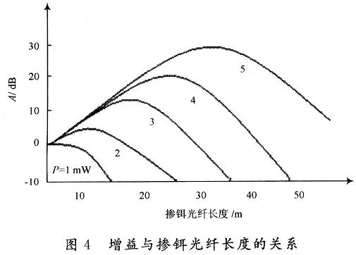 由于摻鉺光纖本身的損耗,造成信號光中被吸收掉的光子多于受激輻射產生的光子,引起增益下降。由上述討論可知,對于某個確定的入射泵浦功率,存在著一個摻鉺光纖的最佳長度,使得增益最大。增益與摻鉺光纖長度的關系如圖4所示。