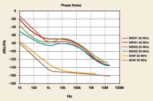 相位噪聲圖很好地展示了這些采用了不同技術的器件的設計與特性。鄰近區(qū)相位噪聲水平(<1kHz)主要取決于Q值或諧振器的選擇,石英BAW諧振器的選擇性遠高于其他MEMS器件。