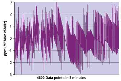 如圖2所示,此處給出的短期穩(wěn)定度數(shù)據(jù)是在8分鐘內(nèi)每隔0.1s測量穩(wěn)定在25℃(誤差僅零點幾度)的振蕩器的頻率值。各部分均由安捷倫53152頻率計數(shù)器測試,該計數(shù)器利用銣原子頻率標準參考源進行工作。頻率變化以第一次讀數(shù)的百萬分率為單位顯示在圖中。